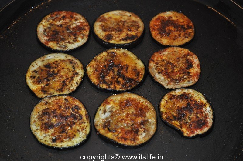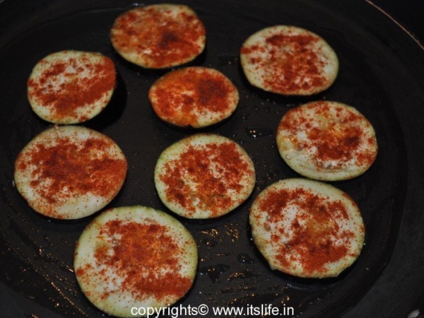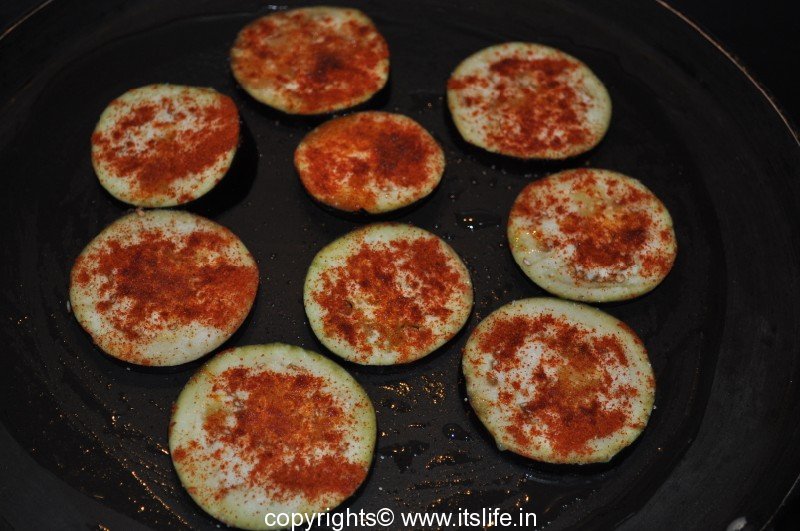 Apply Salt, Pepper, and Chili Powder to the Brinjal roundels.