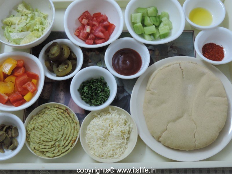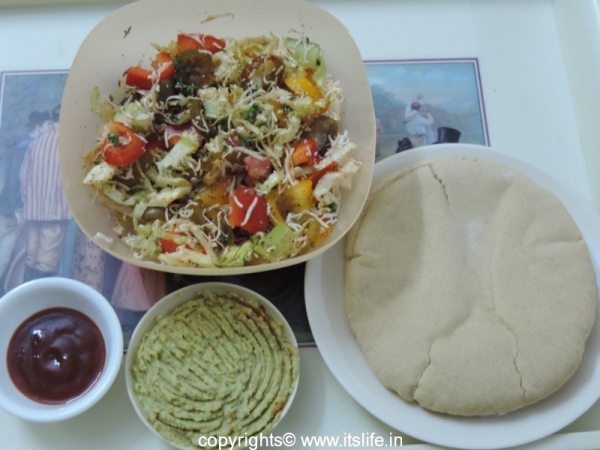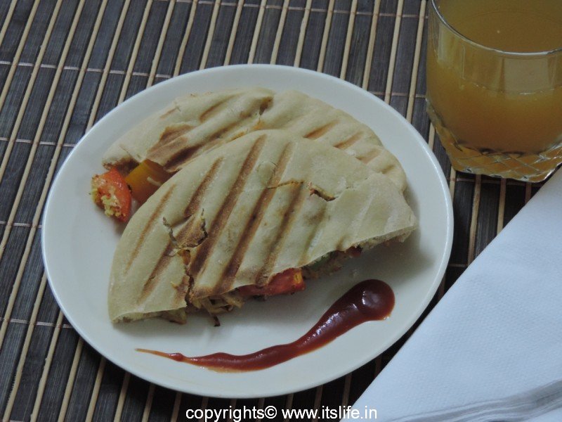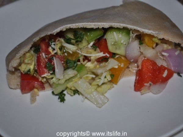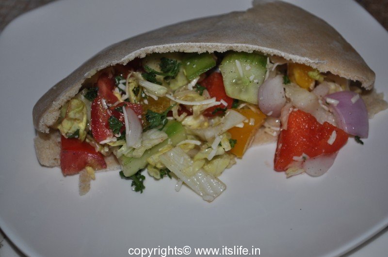 Pita Bread Sandwich is a tasty wholesome meal. Need not have all the ingredients mentioned in this recipe. You can use cream cheese instead of Hummus or you can use Green Capsicum instead of Red and Yellow Pepper, and so on.