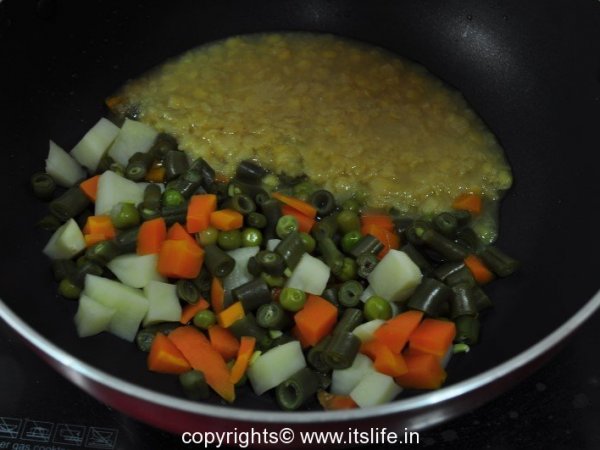 Add cooked lentil/dal to the boiled vegetables.