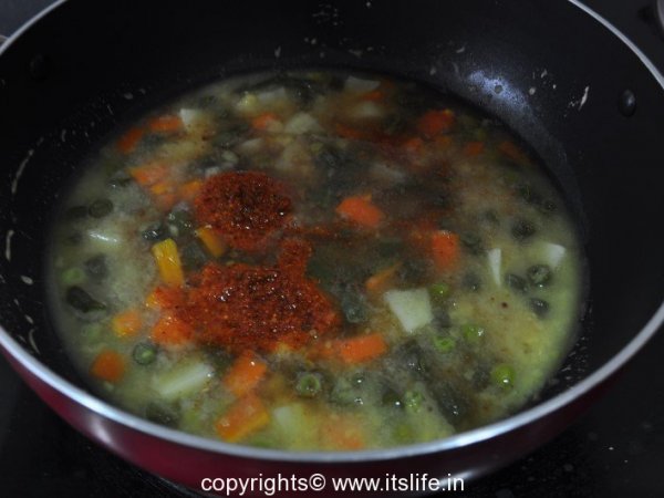 Add Tamarind water, Jaggery, Bisibelebhath Powder, and Salt. Mix well.
