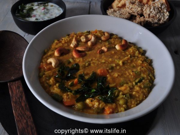 Cook the lentil of your choice. Boil vegetables with salt. Wash Avalakki in water. Sieve and keep aside. Heat a teaspoon of Ghee and fry Cashew nuts until golden brown.