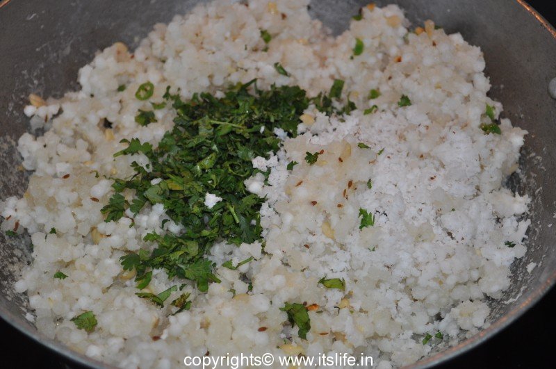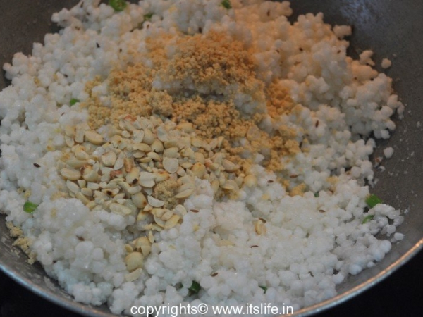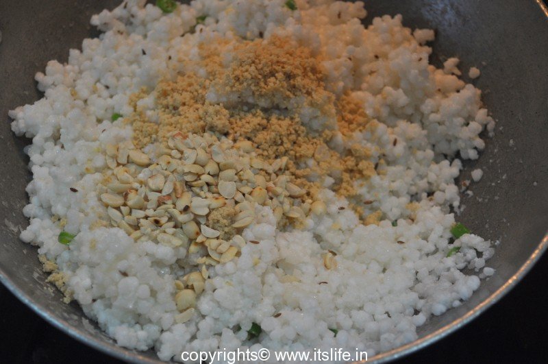 Stir for 2 to 3 minutes. Add Sabudana, Salt and stir. Close the kadai and cook for 2 minutes on low flame. Remove the lid and stir. Add Groundnuts, Lemon juice and Coconut and stir.