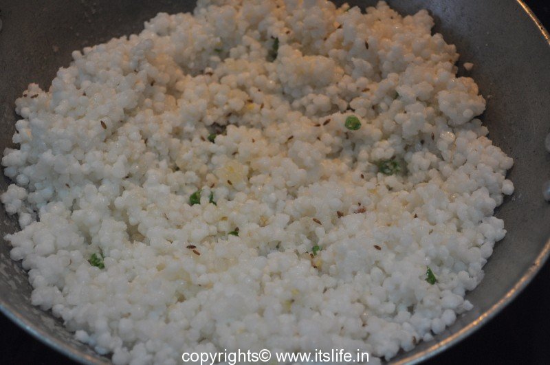 Soak Sabudana in 1½ cups of water for 6 hours. Heat Oil in a kadai/pan; add Mustard Seeds, Jeera and when they splutter add Green Chilies, Curry leaves and Potatoes.
