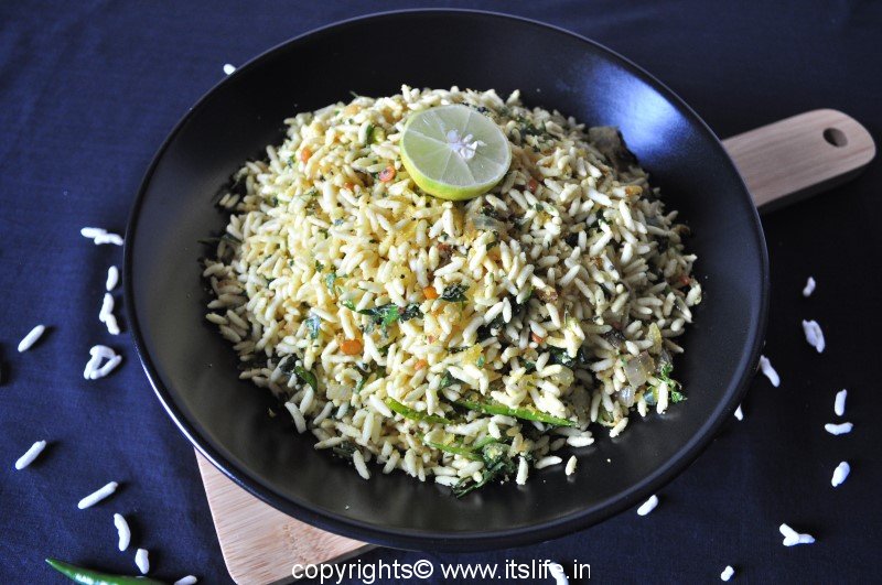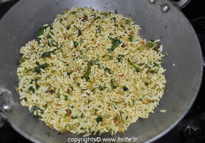 Soak the Puffed Rice in water for a minute and squeeze out the water from the Puffed Rice and add this immediately to the Onion mixture and mix well. Add Fried Gram powder, Lemon juice, Coriander leaves, Sugar and Salt and mix well.