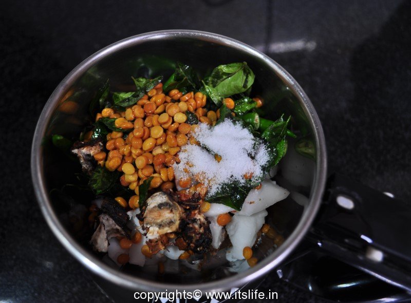 Remove from heat. Grind Coconut, Green Chilies, Bengal Gram/Curry leaves, Tamarind and Salt to a paste.