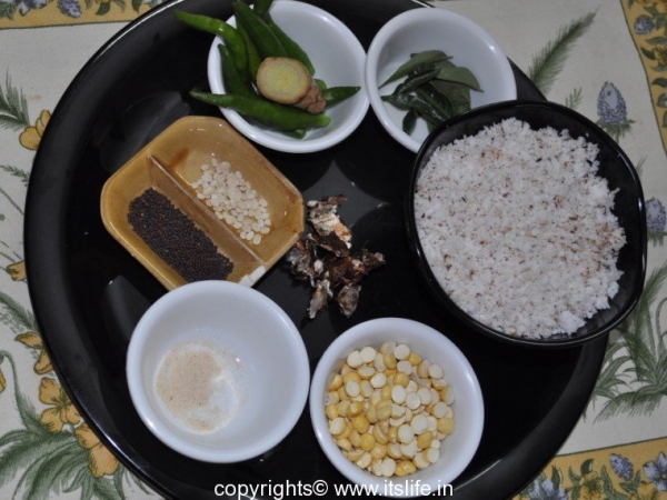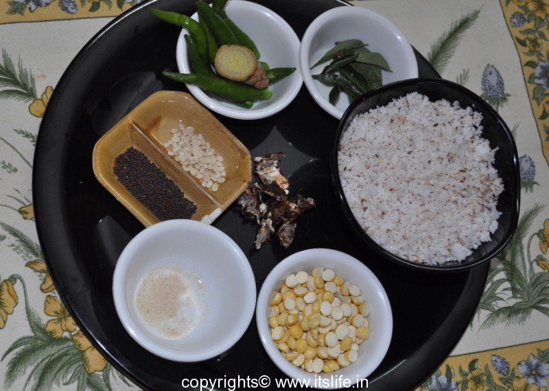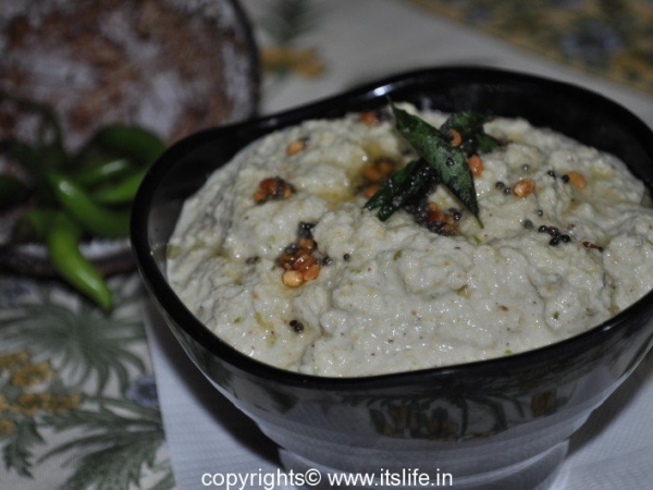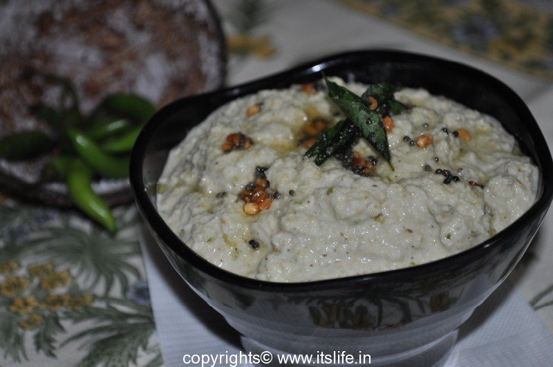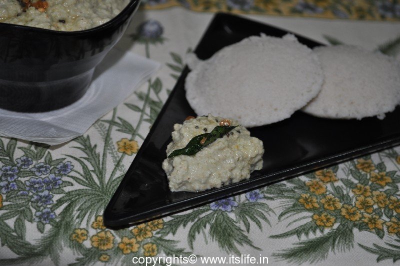 Grind all the ingredients together to a paste. Add required quantity of water. Remove to a bowl. Heat Oil add Mustard Seeds and when they splutter add Curry leaves. Let the seasoning cool before adding it to the chutney.
