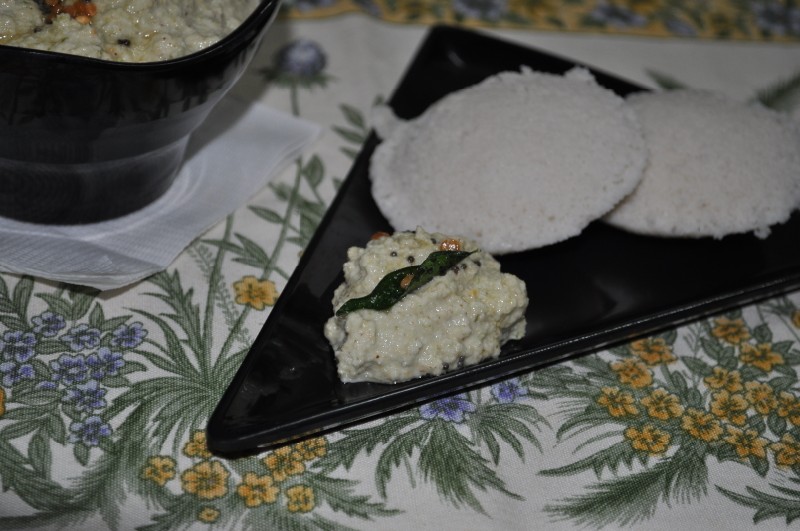 Grind all the ingredients together to a paste. Add required quantity of water. Remove to a bowl. Heat Oil add Mustard Seeds and when they splutter add Curry leaves. Let the seasoning cool before adding it to the chutney.