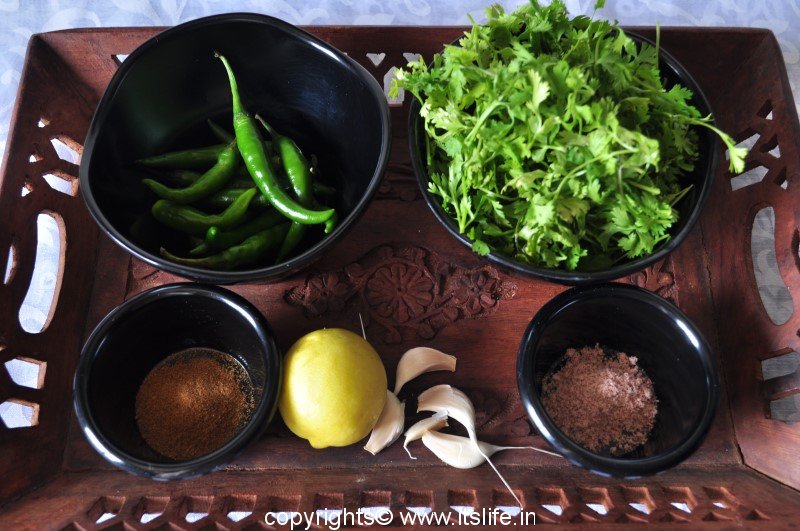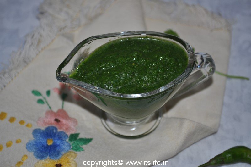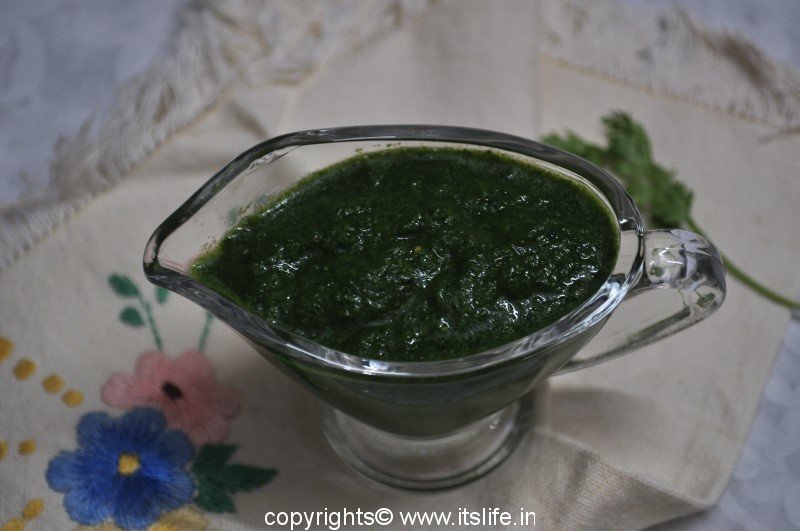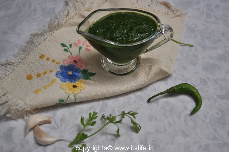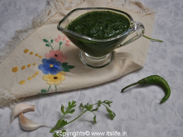 Coriander Garlic Chutney is used in while preparing Chaats. It adds a spicy and garlicky flavor to the chaat. This can be served along with Dhokla or with Parathas (Indian Stuffed Bread).