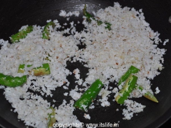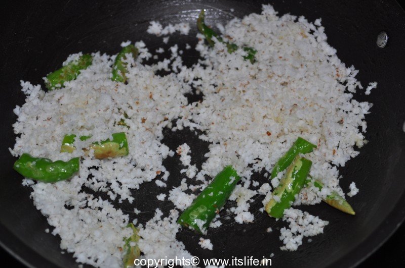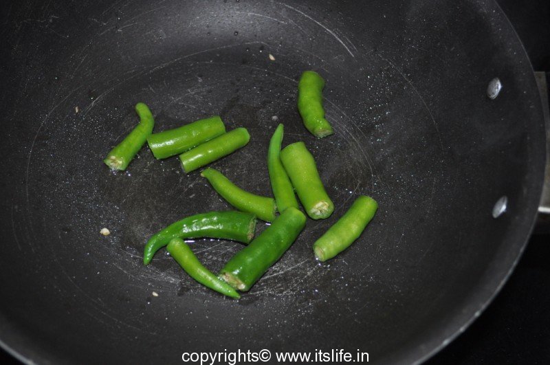 Heat Oil in a pan and add the Green Chilies and saute for a minute.
