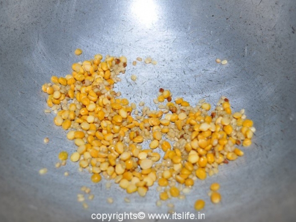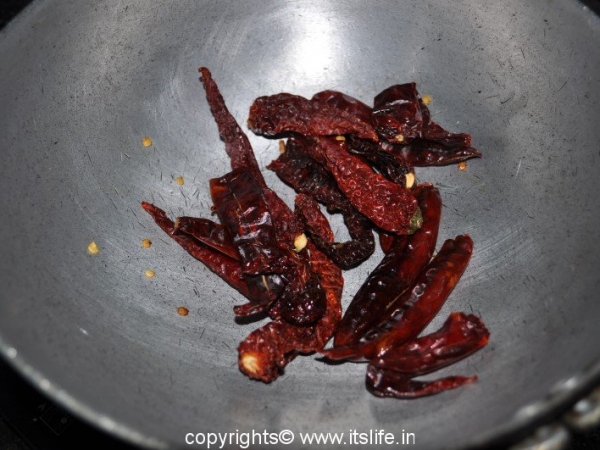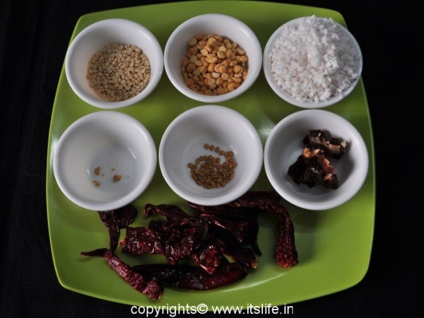 Roast Bengal Gram, Urad Dal, Hing, Red Chilies, and Coconut in little Oil until they change color.