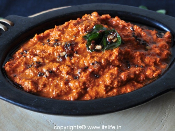 Grind Coconut, the fried ingredients, Tamarind pulp and salt to a paste. Add more water if needed.