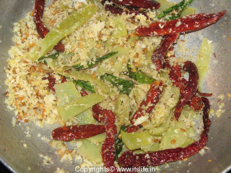 Cook the peel until soft with water, Salt, Jaggery and Tamarind. Remove the cooked peel and keep aside. Do not throw the water.