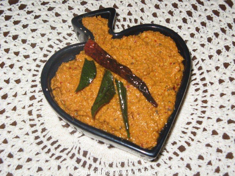 Heat 1½ tsp Oil, add Mustard Seeds and when they splutter, add Turmeric Powder, 1 Red Chili, Few Curry leaves. Pour this over the Chutney and mix well.
