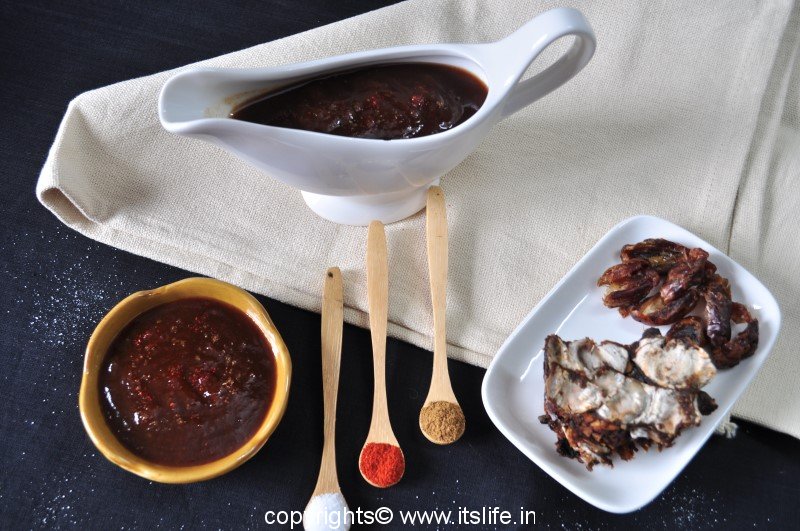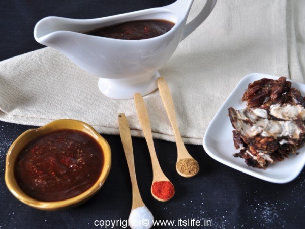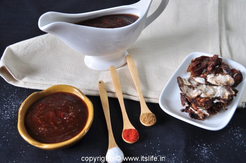 Sweet Chutney is prepared using Tamarind and Dates. This is a tangy and sweet chutney used in preparation of Chaats.