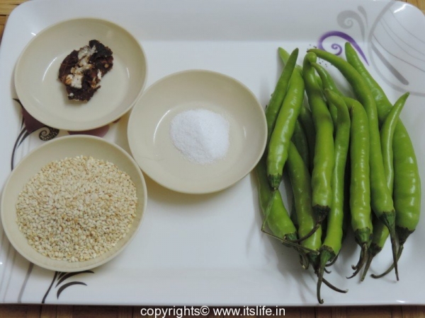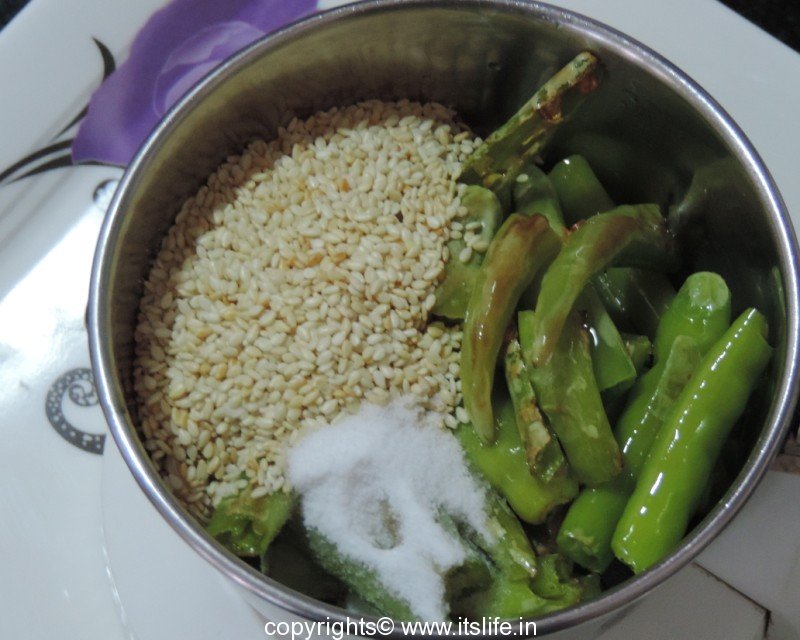 Grind Sesame Seeds, Green Chilies, Tamarind, Salt to a paste. Remove and add the remaining Oil and mix well.