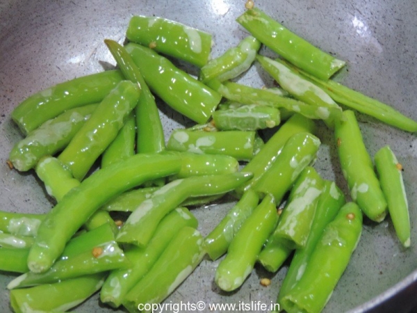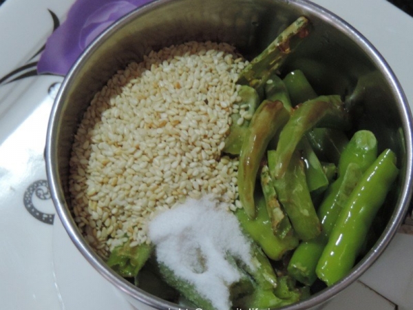 Roast Sesame Seeds. Heat Oil and add Green Chilies and close the lid. When the Chilies start turning white remove and add to the Sesame Seeds.