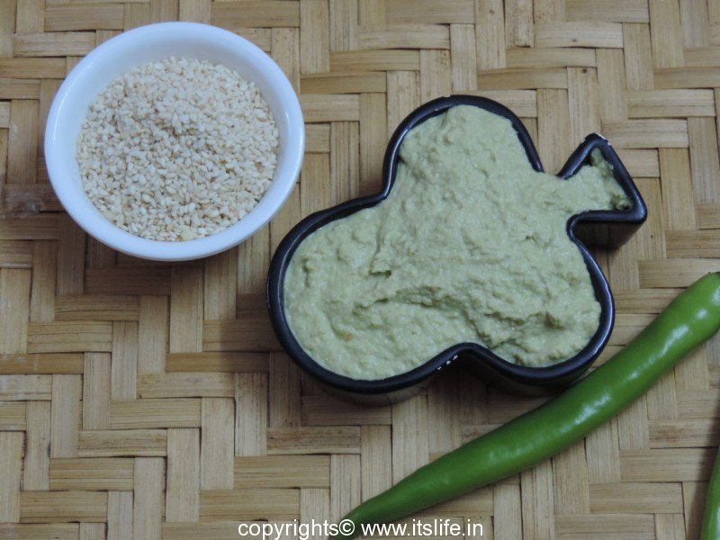 Yellu Hasimenasinakayi Chutney is a chutney prepared using Sesame Seeds and Green Chilies. This can be stored for three days without refrigeration.