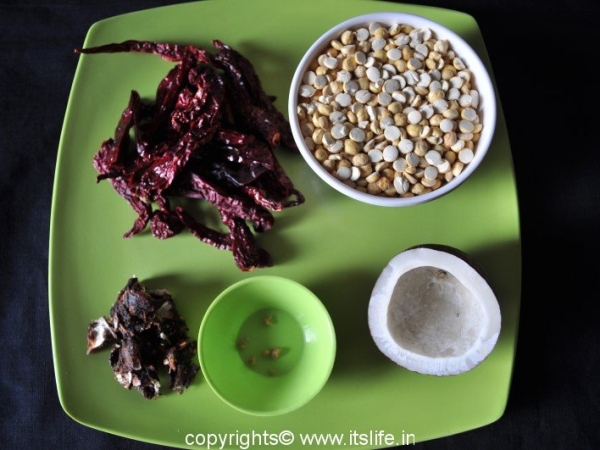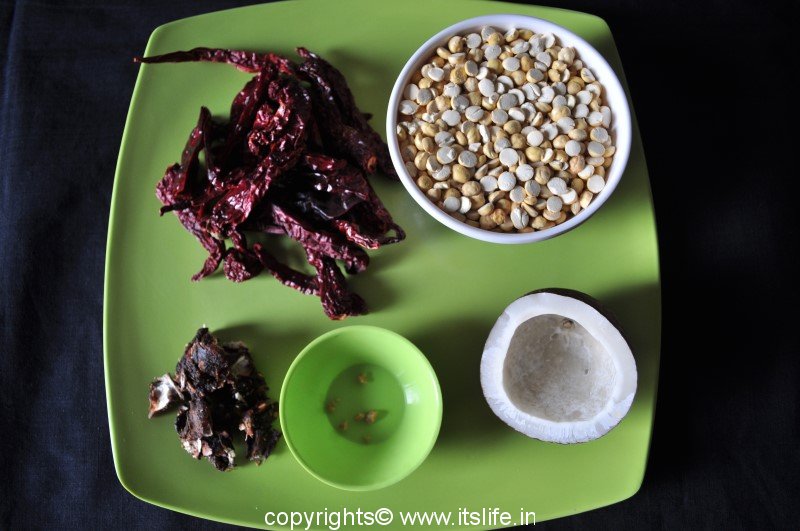 Heat Oil and add Hing, Tamarind and Red Chilies and stir for 2 minutes. Switch off the heat and add Fried Gram and stir for few seconds. Let it cool. Grind Fried Gram, Hing, Red Chilies, Tamarind and Salt to a powder.