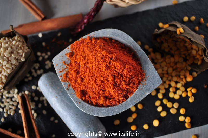 Fry the ingredients for the masala powder in little Oil and grind to a powder.