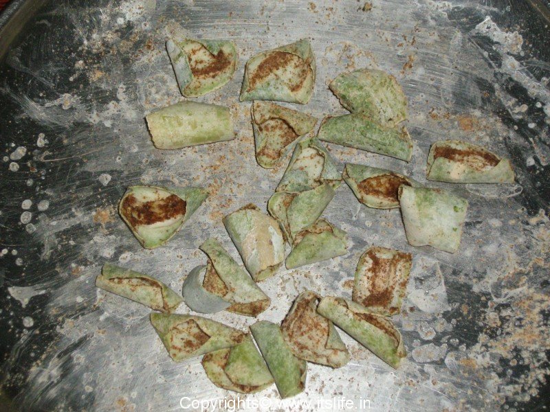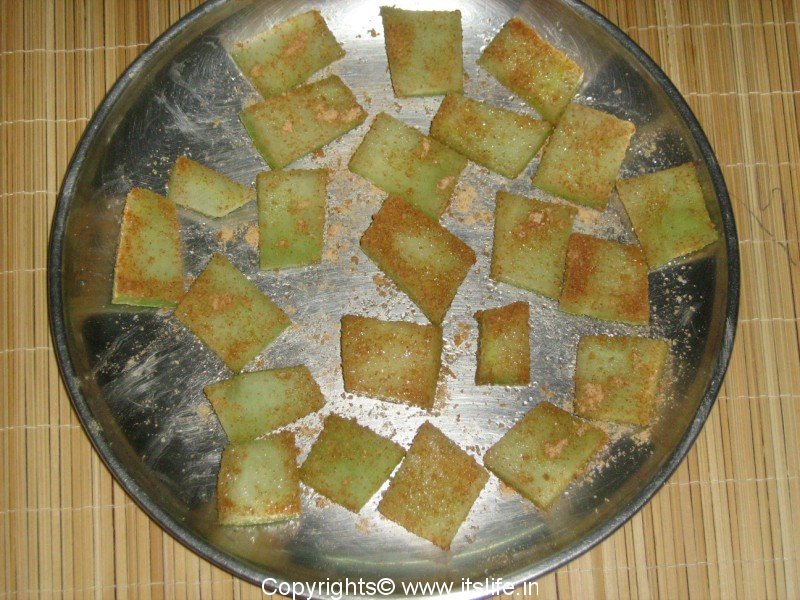 On a steel tray arrange the masala smeared peels and sun dry for a day. By evening the peels become crumpled and dried. Store them in an airtight container.