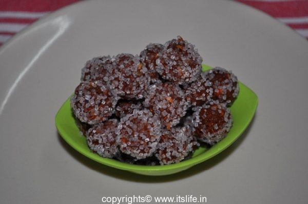 Divide the mixture into small balls and roll on Sugar. Store in an airtight jar.