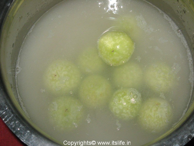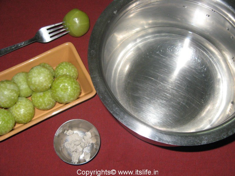 Dilute Sunna in water and put all the Gooseberries in it and keep it aside for an hour. Remove the Gooseberries and wash them in plain water.