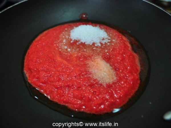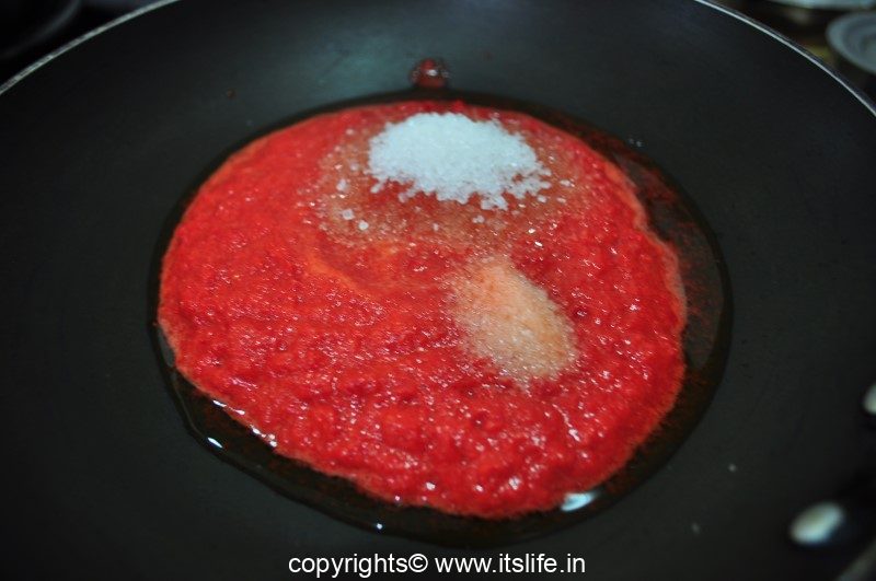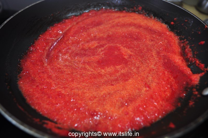 In a thick-bottomed pan, add the Chili paste and cook for 5 minutes. Add Vinegar and cook for another 5 minutes stirring continuously.