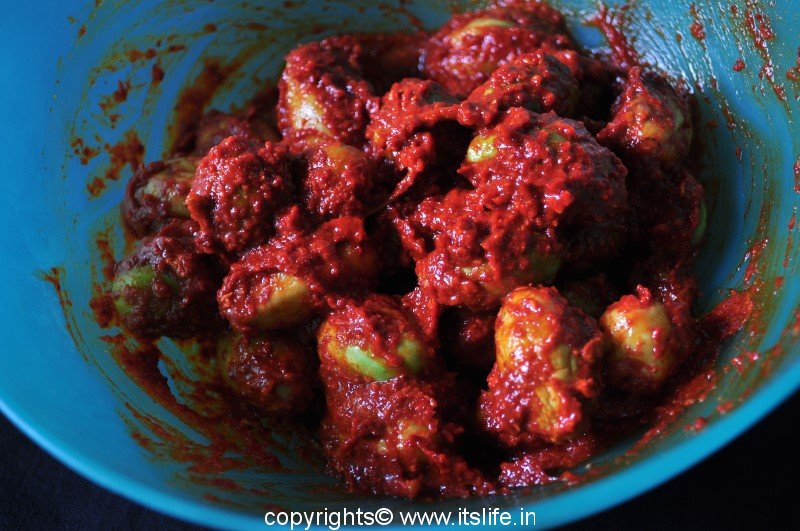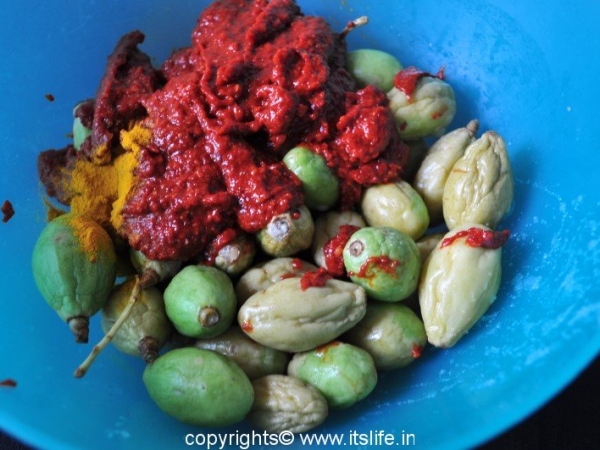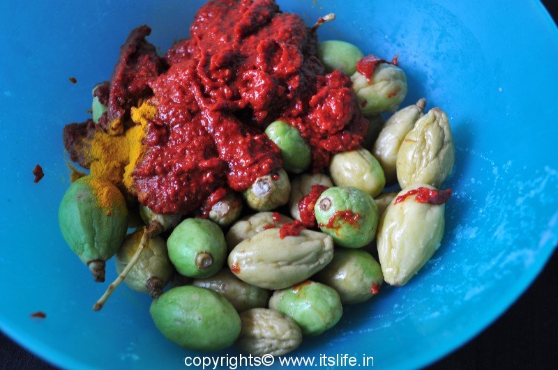 Remove the Salt water collected in the jar and soak Red Chilies, Menthya, Mustard Seeds, Hing and Turmeric Powder for an hour in the salt water. Grind to a paste and add it to the Hog plums.