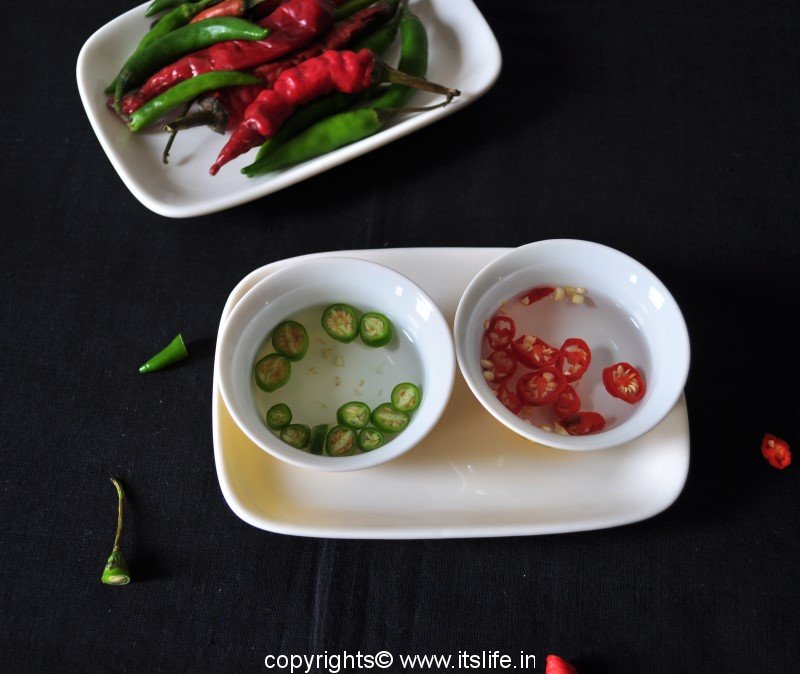 Cut Green Chilies into small pieces and mix with Vinegar. Store in airtight glass bottles.
