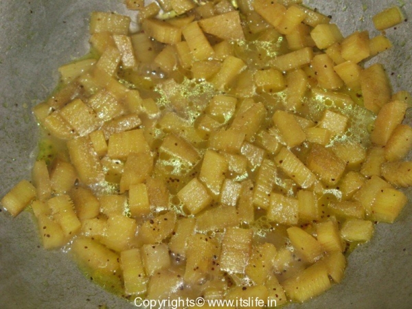 Heat Oil, add Mustard Seeds, Turmeric Powder and the Banana Stem pieces and sauté for 2 minutes. Add 1 cup water and cook until the pieces are little soft. Add Thogaribele / Tuvar Dal, Tamarind extract, Asafoetida, Salt, and Jaggery. Add the masala paste and 1 cup of water and let it come to a boil.