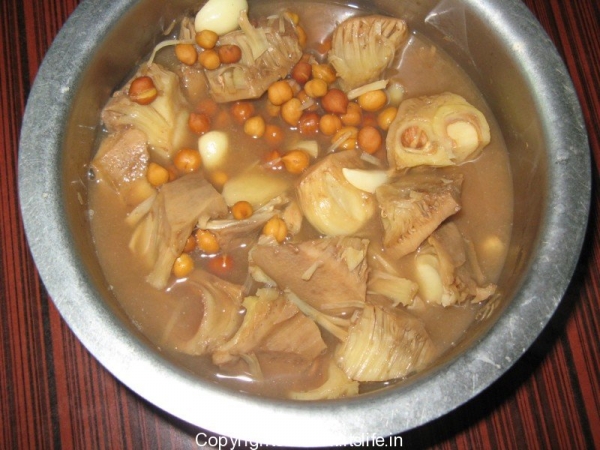 Grind Coconut and Hulipudi/Sambar powder to a paste. Extract 2 cups of Tamarind water. Pressure cook Tur dal and Chik peas separately and keep it aside. Boil Tamarind water and Jackfruit pices in a thick bottomed vessel for 5 to 8 minutes. Add the hulipudi paste, Tur dal, Chik peas, Salt, Jaggery and let it come to a boil. If the mixture is too thick, add water and boil. Cook for at least 5 to 6 minutes continuously stirring.