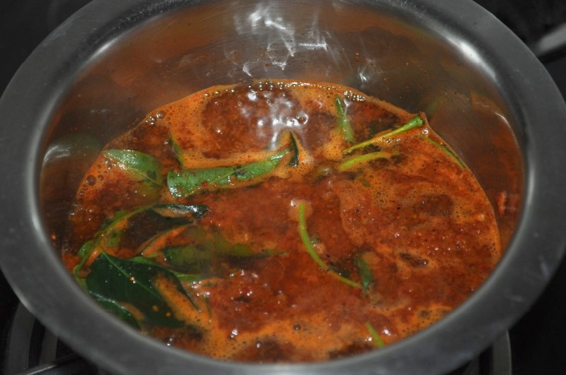 Heat 2 Glasses of water, add Tamarind pulp, Curry leaves, Saarina Pudi, and Salt. Let it boil for 5 minutes.