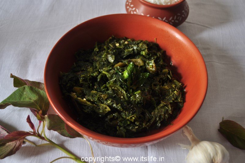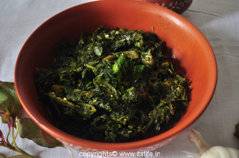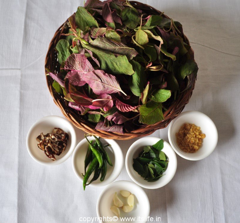 Pick, clean and wash the leaves. Chop finely. Add a cup of water and pressure cook the leaves along with Green Chilies. Remove the leaves to a thick bottomed pan and add Tamarind extract, Jaggery and Salt and mix well. Cook for 2 minutes and remove to a serving dish.