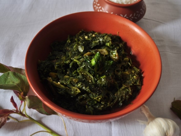 “Bolu” in kannada means nothing and “Huli” means curry or more popularly called as Sambar. As tuvar dal, Huli Pudi/Masala powder or fresh coconut is not added to this curry, it is known as “Bolu Huli”. This curry prepared using Red Amaranthus leaves is extremely delicious with Tamarind adding the dash of Huli/sourness to the dish and the aroma of Amaranthus leaves mixed with Green Chilies. This can be prepared using only lentils like Alsande/Cow peas, Whole Green Gram or can be prepared using mixed vegetables or combining lentils and leafy vegetables.