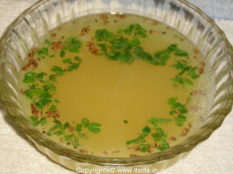 Cook Tuvar Dal along with Turmeric Powder. Mash it well and add 4 cups of water and boil it along with Salt, Pepper Powder and Curry leaves. Remove from heat and fish out the curry leaves. Heat Oil and add Jeera and Asafoetida. Add this seasoning and Lemon juice to the Saru and serve hot garnished with Coriander leaves. This can be either relished as a soup or as an accompaniment with plain Rice.