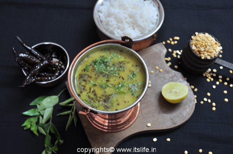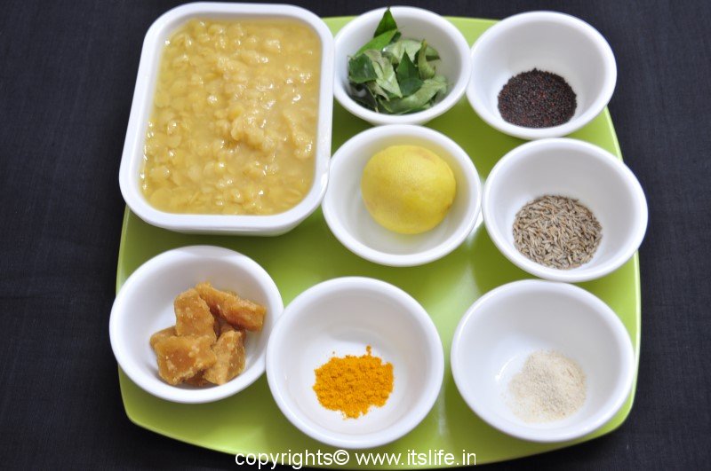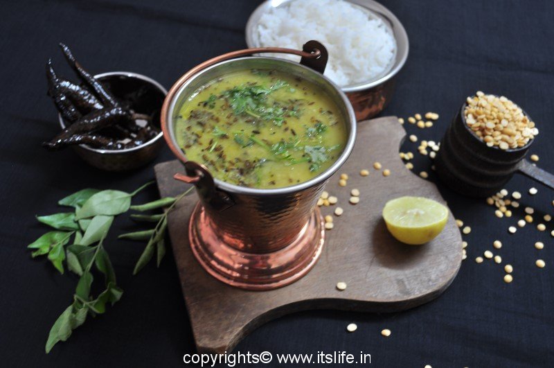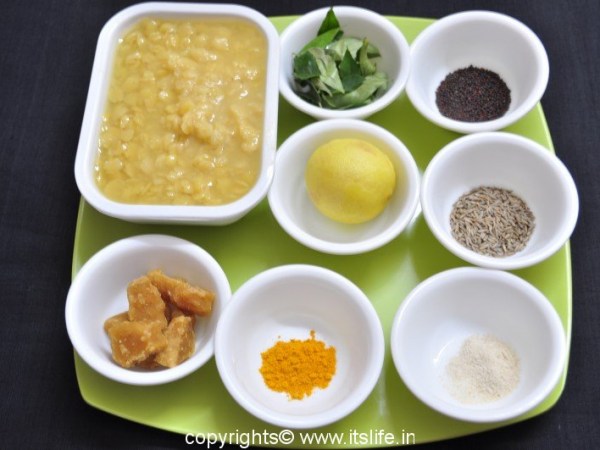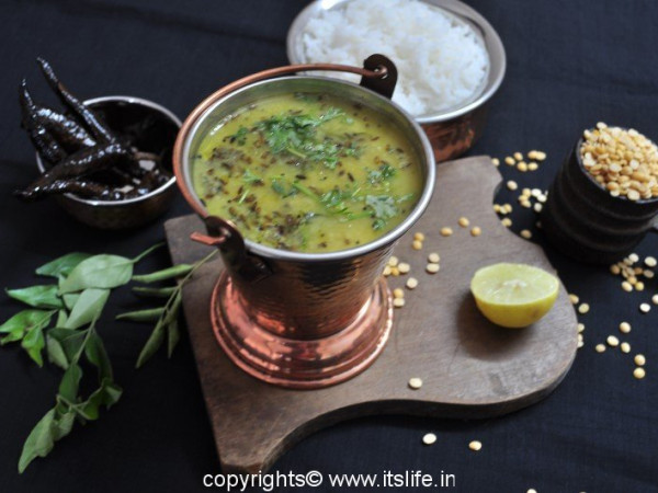 Add Jaggery, Salt, and curry leaves to the cooked dal. Let it come to a boil. Add Lemon juice and Coriander leaves. Let it cook for a minute.