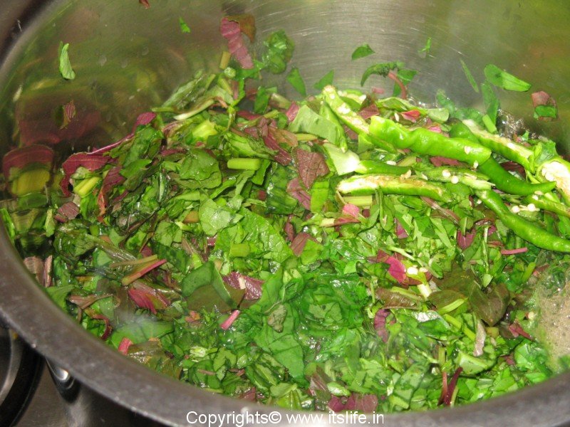 Clean leafy vegetables and chop finely. Pressure cook Tur Dal and Chik Peas. Cook leafy vegetables and Onion in a vessel along with 2 cups of water for 5 minutes. Add Tur Dal and Chik peas to it and mix well. Extract Tamarind pulp and add this to the dal. Grind Huli Pudi and Coconut to a paste and add this to the dal. Add Salt and Asafoetida and let it cook for 5 minutes. If it is too thick add more water and cook.