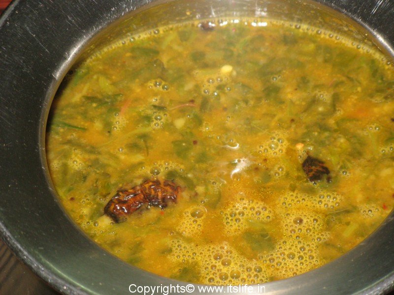 This is a South Indian Curry prepared using leafy vegetables and brown chik peas. It is also known as Sambar.