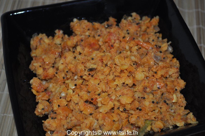 Cook Tuvar Dal with 1 cup water in pressure cooker for a single whistle. Ensure that the Tuvar Dal is not very soft. Sieve the Dal and keep aside.