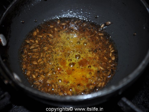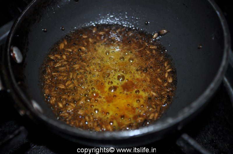 Heat Oil in a seasoning pan and add Mustard and Cumin Seeds. When they splutter, add Hing and Turmeric Powder. Add this to the dal.