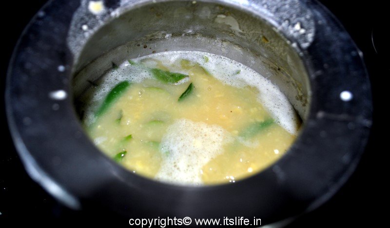 Cook dal until soft. Remove to a thick bottomed container. Add Ginger, Green Chilies, Salt, and Curry leaves. Boil for 3 to 4 minutes. Add 1 glass of water and let it continue to boil for another 2 minutes and remove from heat.