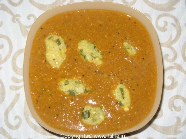 Unde / Nuchchinaunde Huli is an authentic South Karnataka dish. Steamed lentil balls are dunked into lentil based curry and served with plain rice.