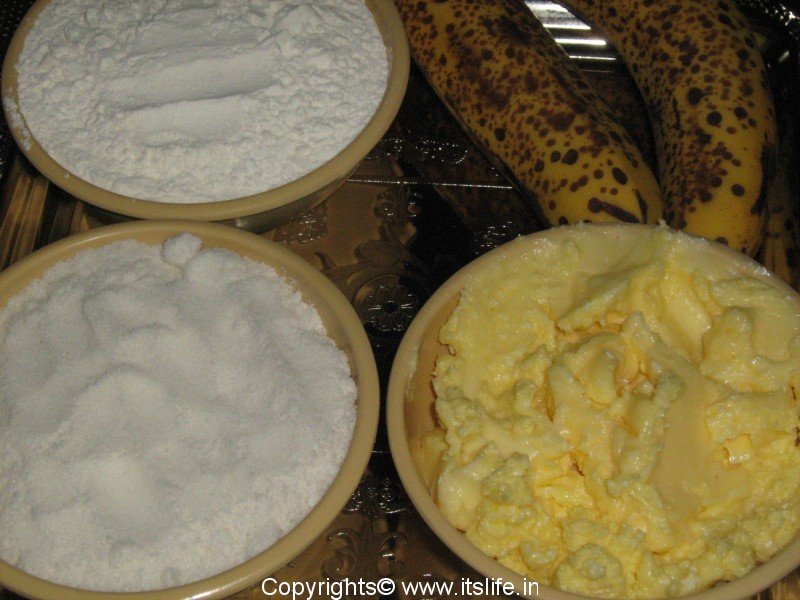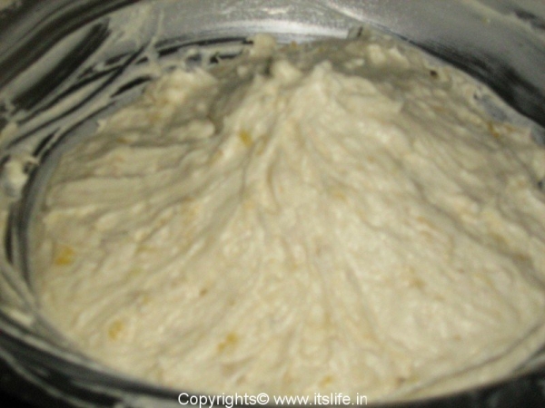 Cream Butter and Sugar in a mixing bowl. Add Flour and little water and mix well. Add mashed Banana and again mix well using hands. Add Fruit Salt and Vanilla essence and mix well.