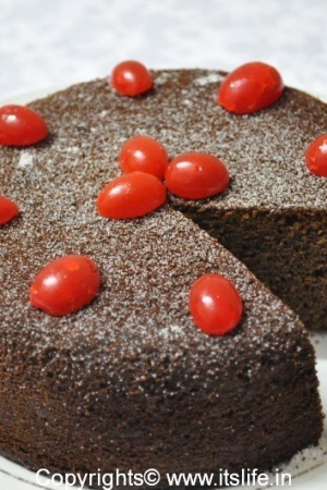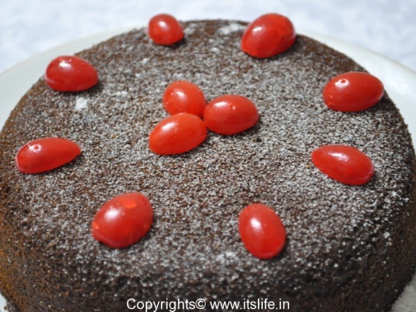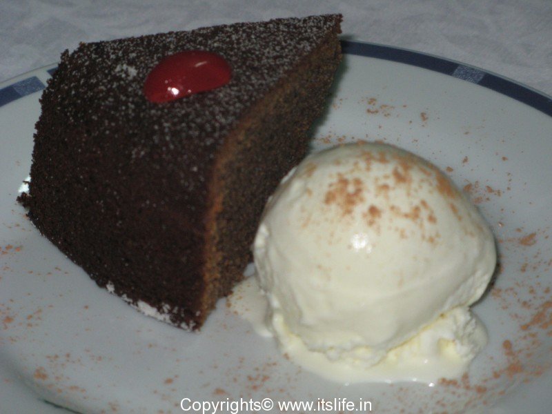 Remove from oven and let it cool. Dust with sugar powder and decorate with Cherries. Serve a slice with a scoop of Vanilla Ice Cream.