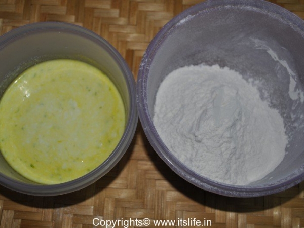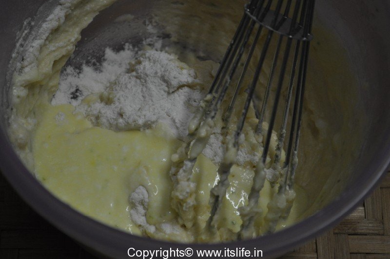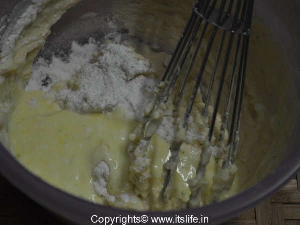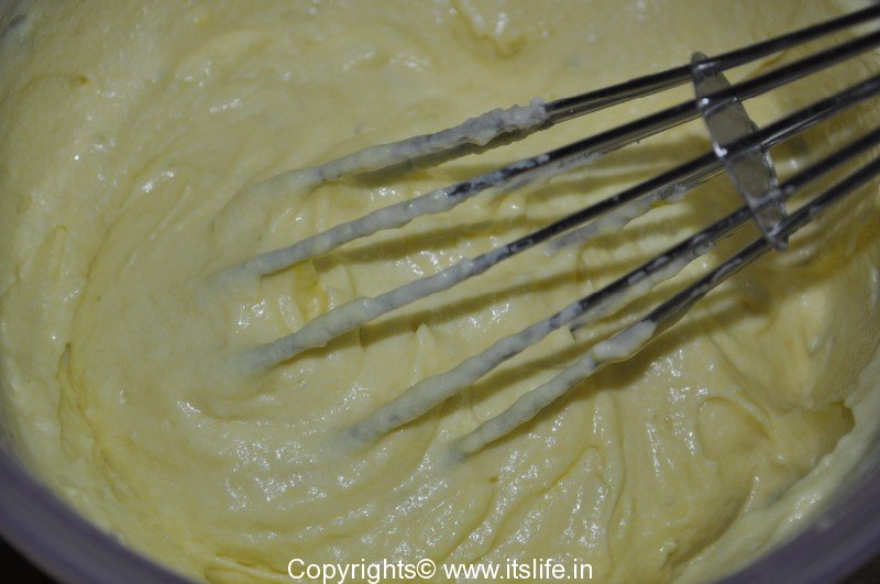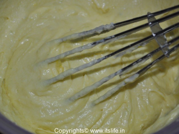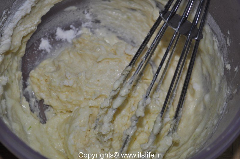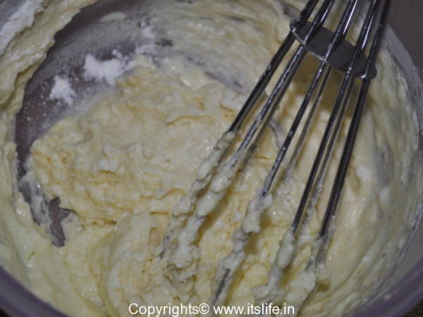Add Curds mixture (1) and Maida mixture (2) alternately to the butter bowl (3) and mix slowly in a single direction.