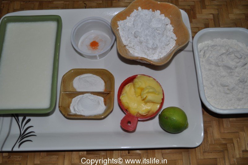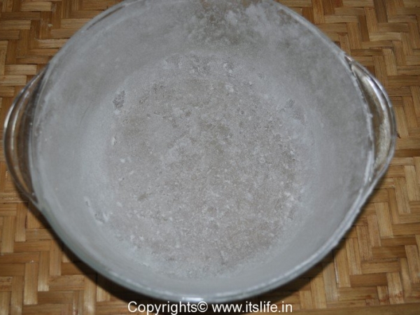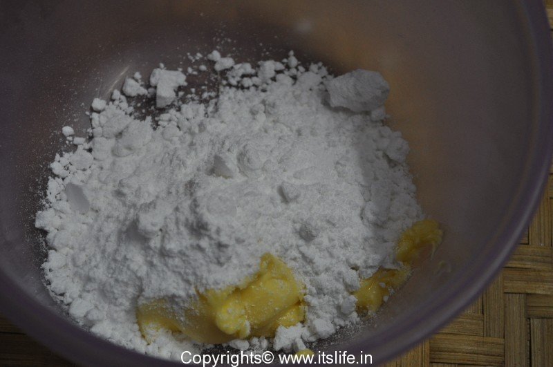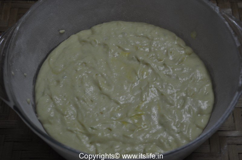 Grease the baking tin with Butter and dust with Maida. Keep aside.