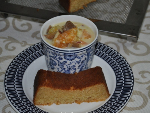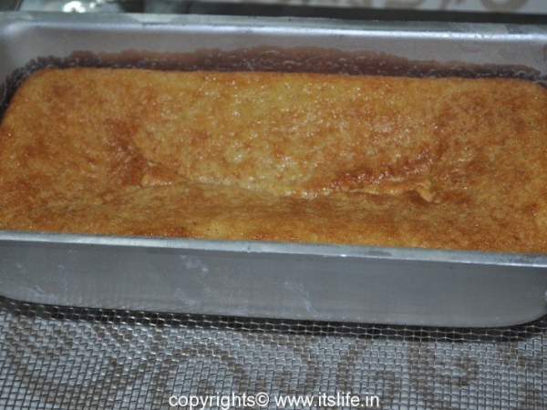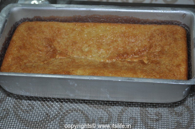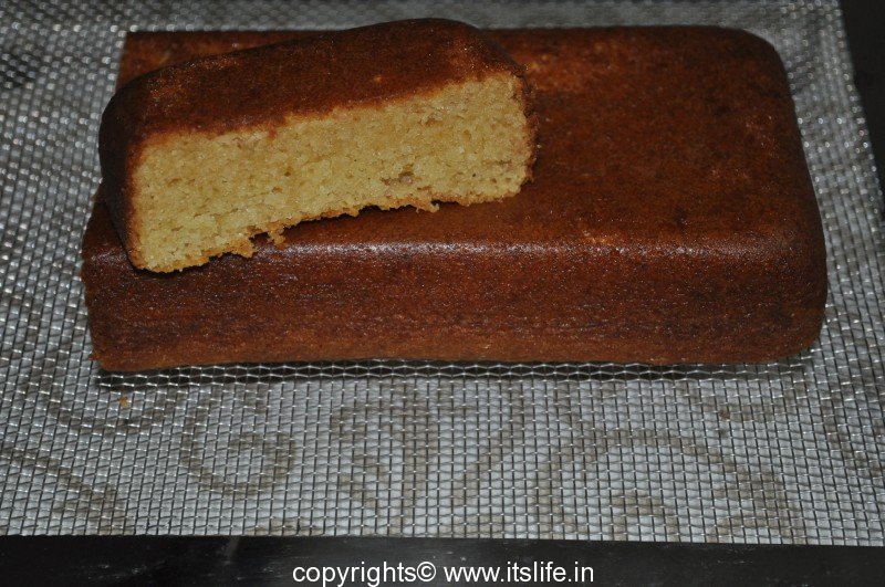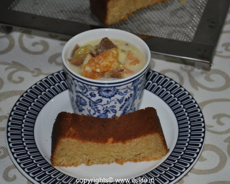 Cut Eggless Mawa Cake into slices and serve with Fruit Custard.