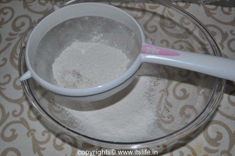 Sieve maida, baking powder, cardamom and soda-bi-carb separately.