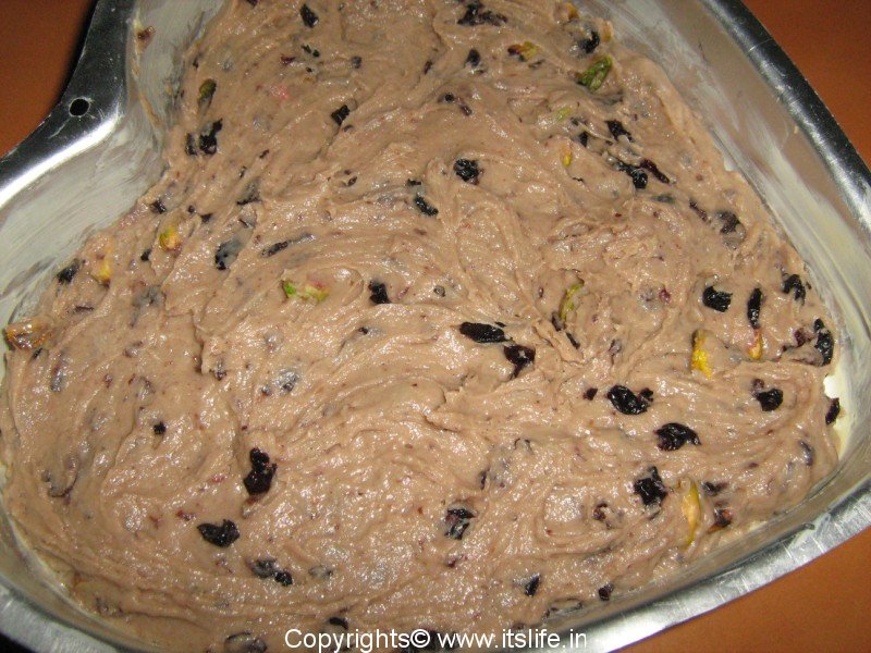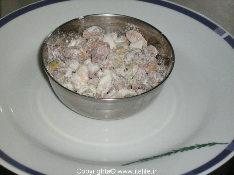 Lightly dust Pistachios with flour. Add Pistachios and Vanilla Essence to the mixture and mix well.