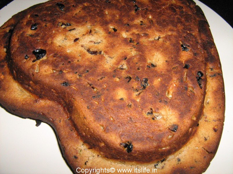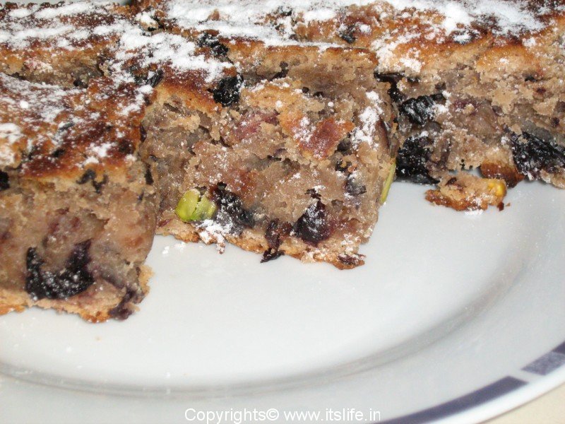 Let it cool and upturn the cake on a dry surface. Cut Eggless Raisin cake into slices and dust sugar powder over the slices and serve.